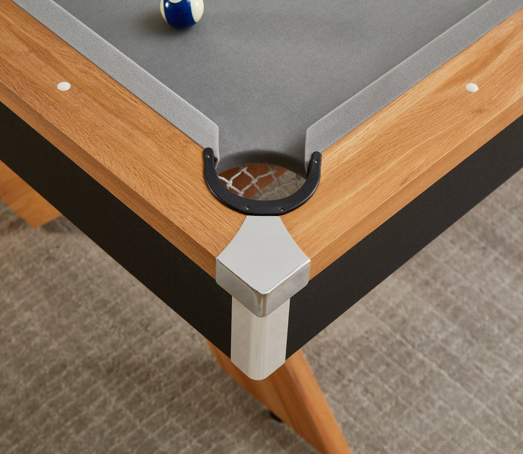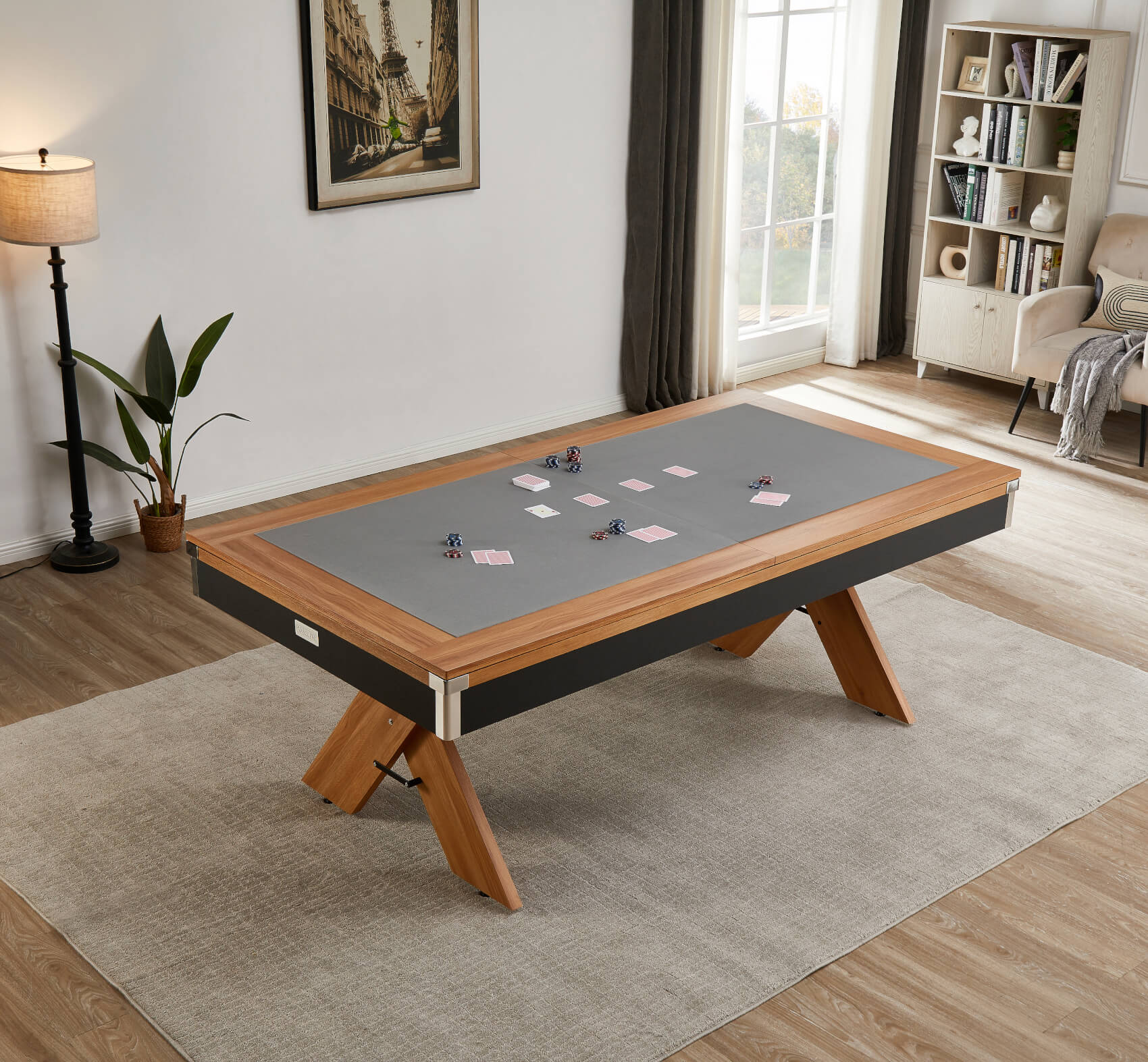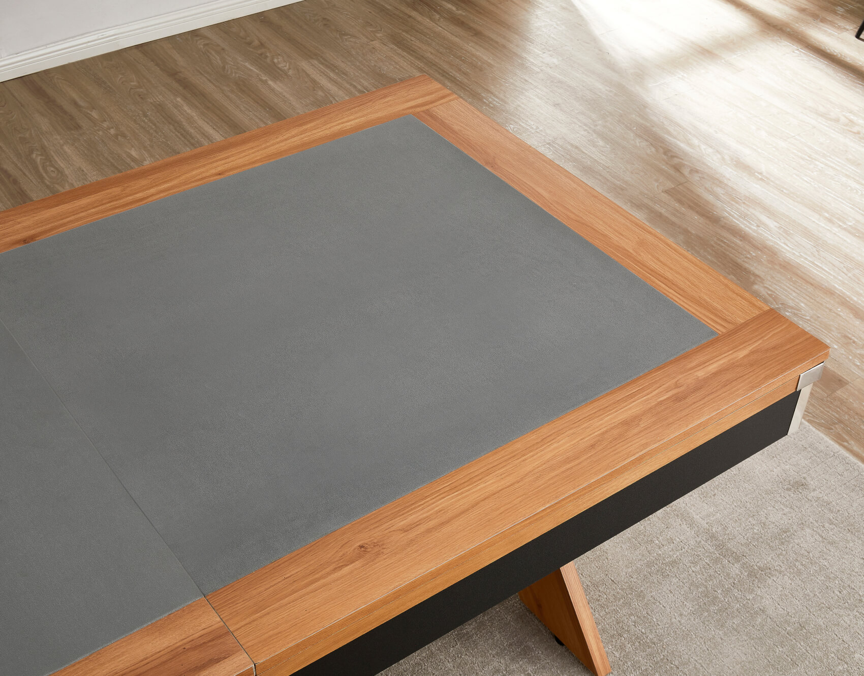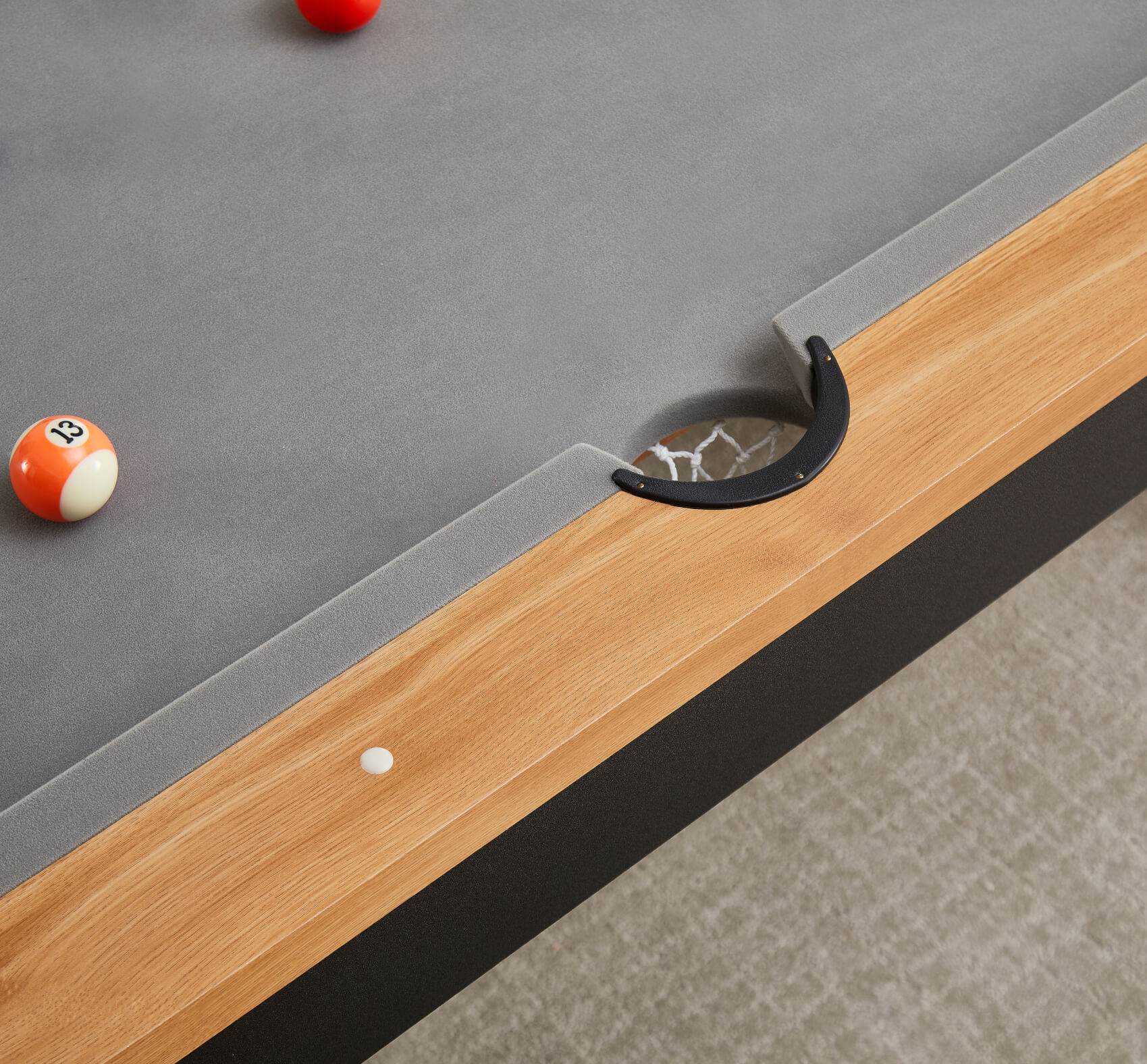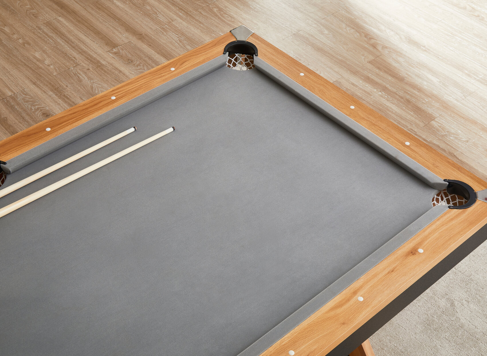 The included two-piece tabletops are finished to match the wood effect on the table's top rail and simply lift on top of the pocket rubbers, keeping the tops away from the rail and preventing any scratches. Flip the tops over to reveal a large grey baize, purpose-fitted for card games. It's ideal for poker, blackjack, rummy or anything else. The baize allows for more tactile dealer operation, making it easier to handle and slide cards to players.