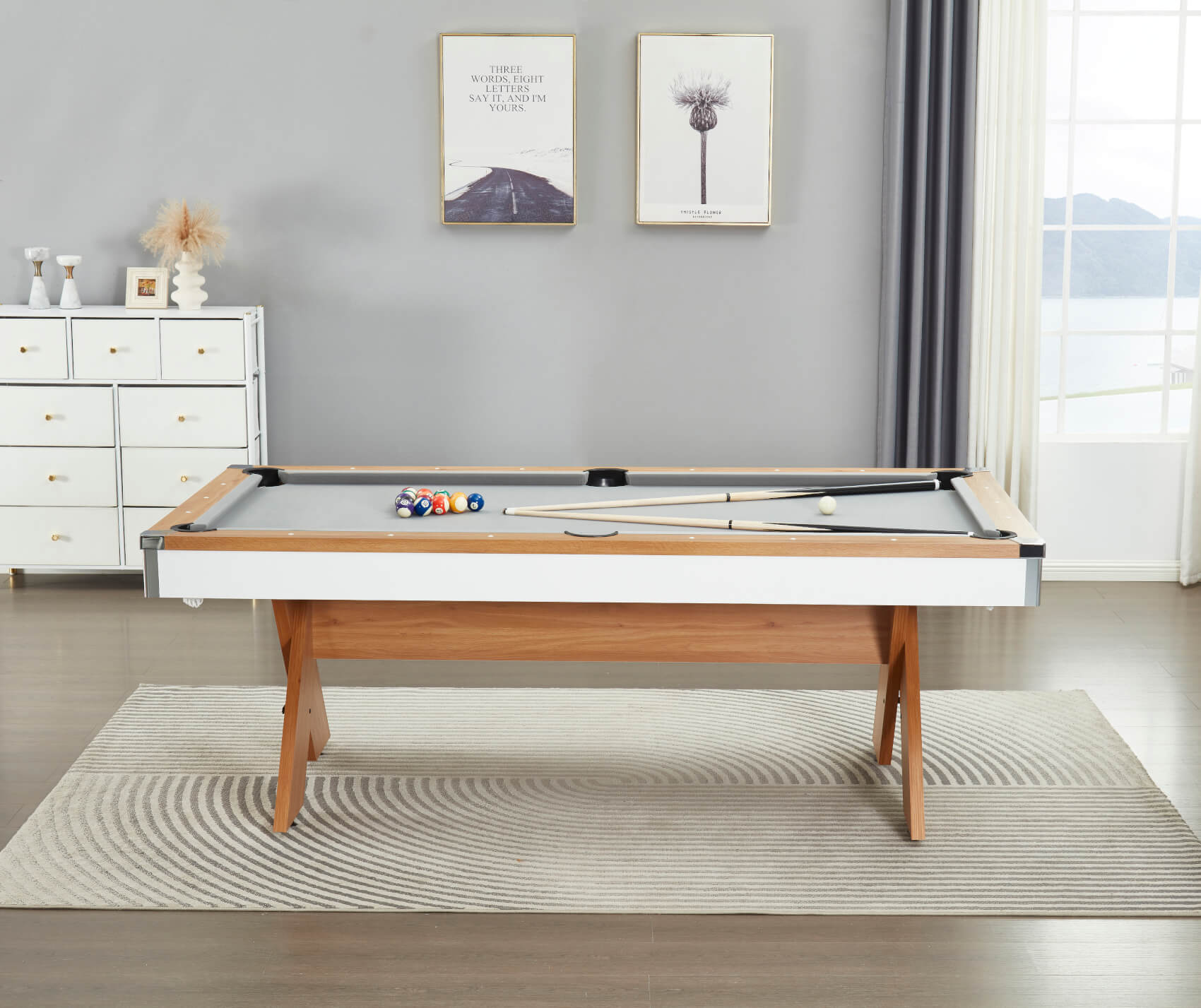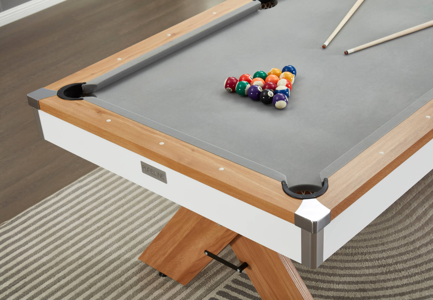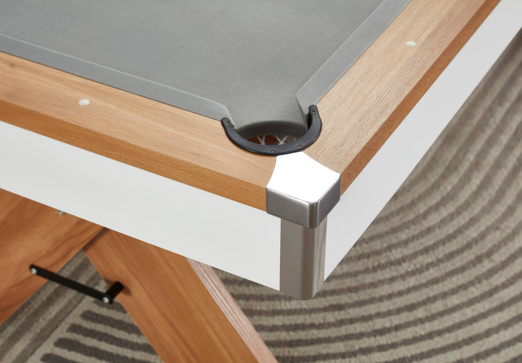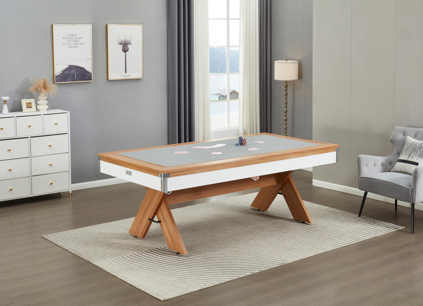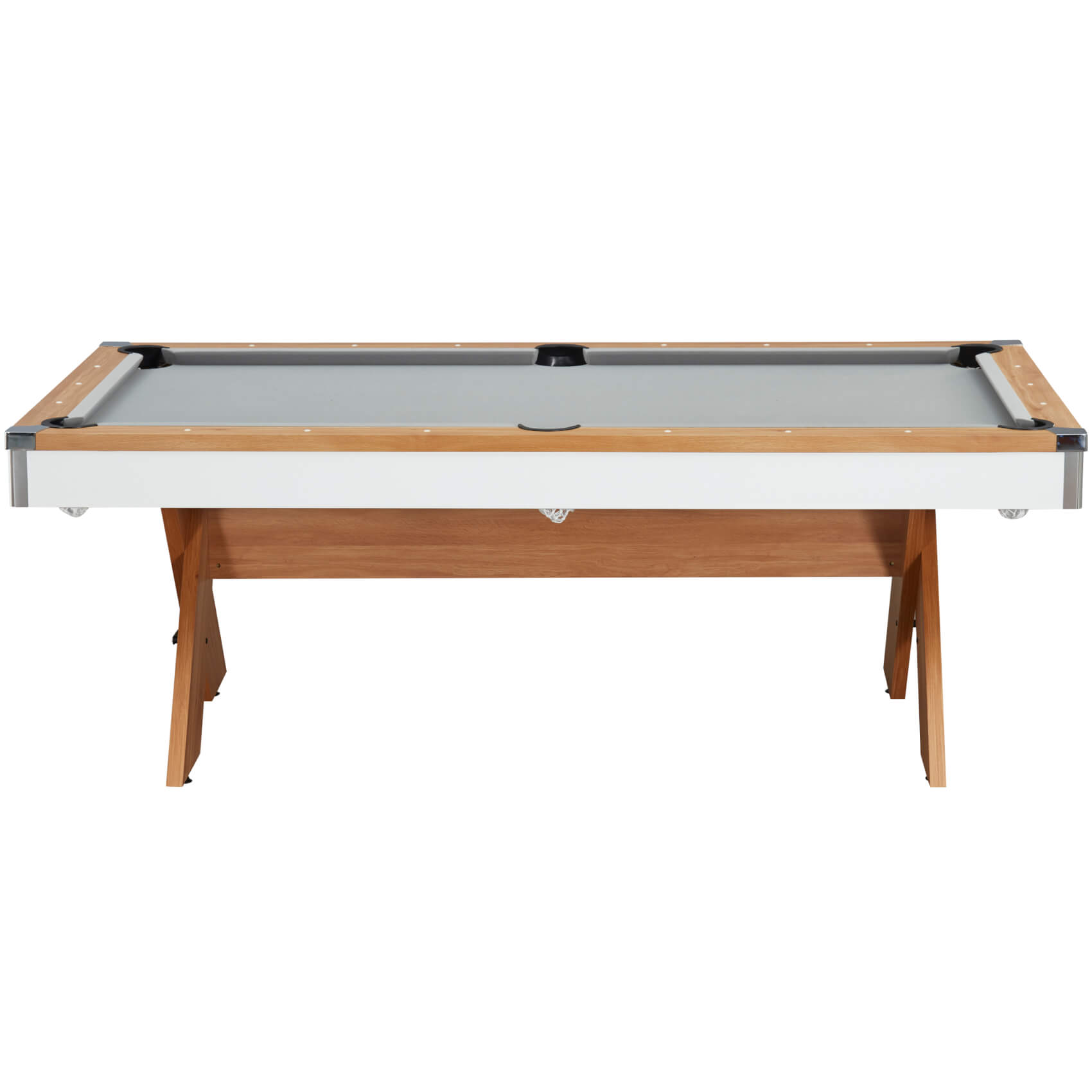 The included two-piece tabletops are finished to match the wood effect on the table's top rail and simply lift on top of the pocket rubbers, keeping the tops away from the rail and preventing any scratches. Flip the tops over to reveal a large grey baize, purpose-fitted for card games. It's ideal for poker, blackjack, rummy or anything else. The baize allows for more tactile dealer operation, making it easier to handle and slide cards to players.