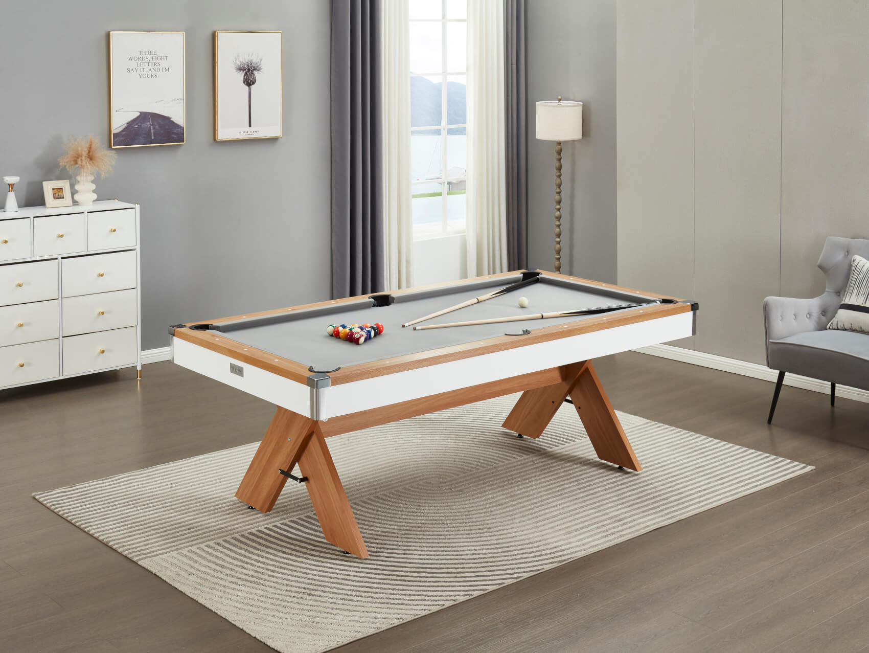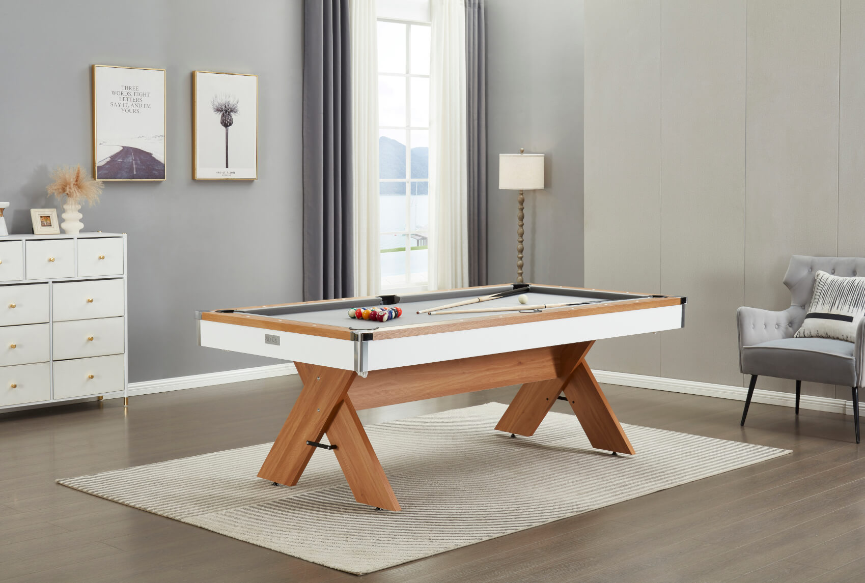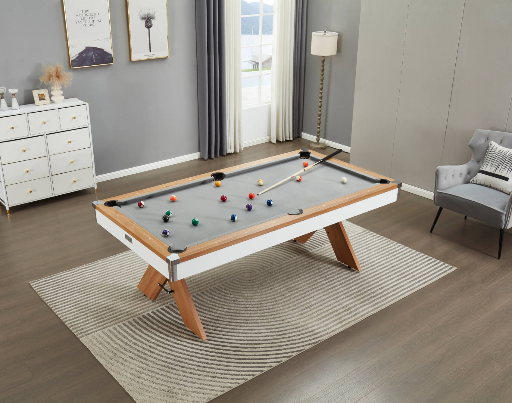 The table comes with two 48-inch cues and a set of 2-inch spots and stripes balls, plus some chalk so you can play as soon as your table arrives.