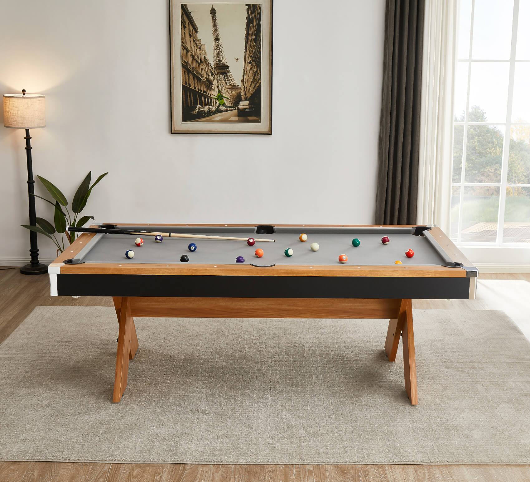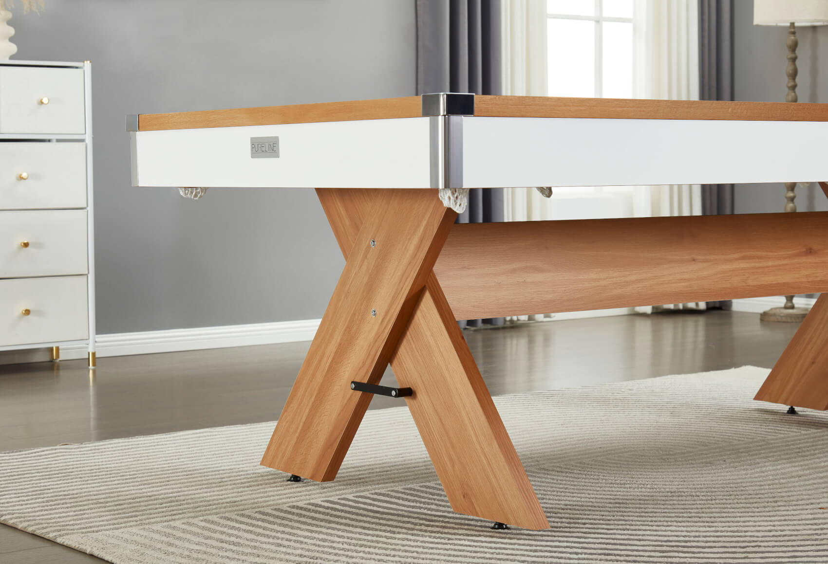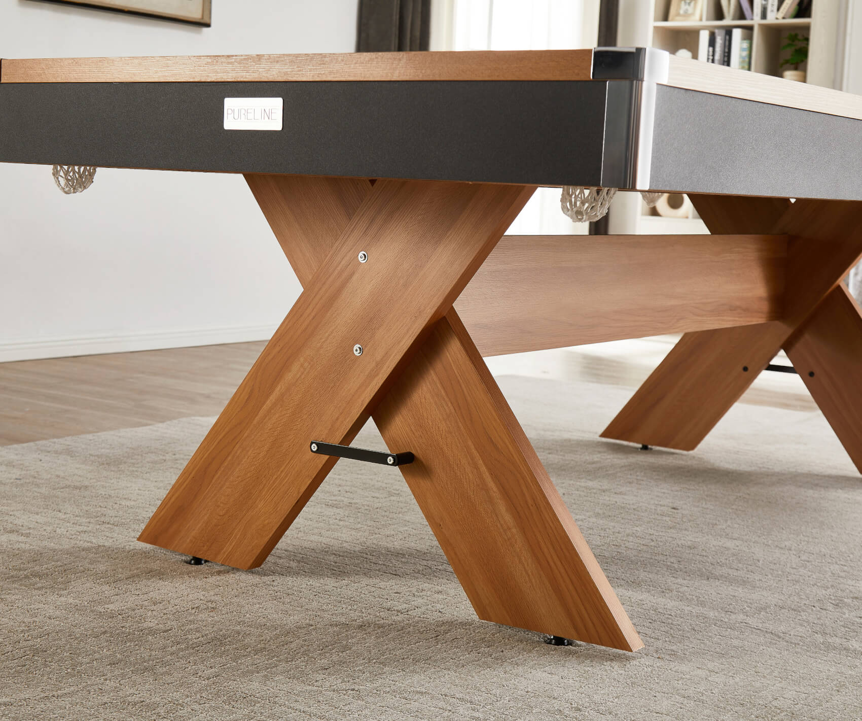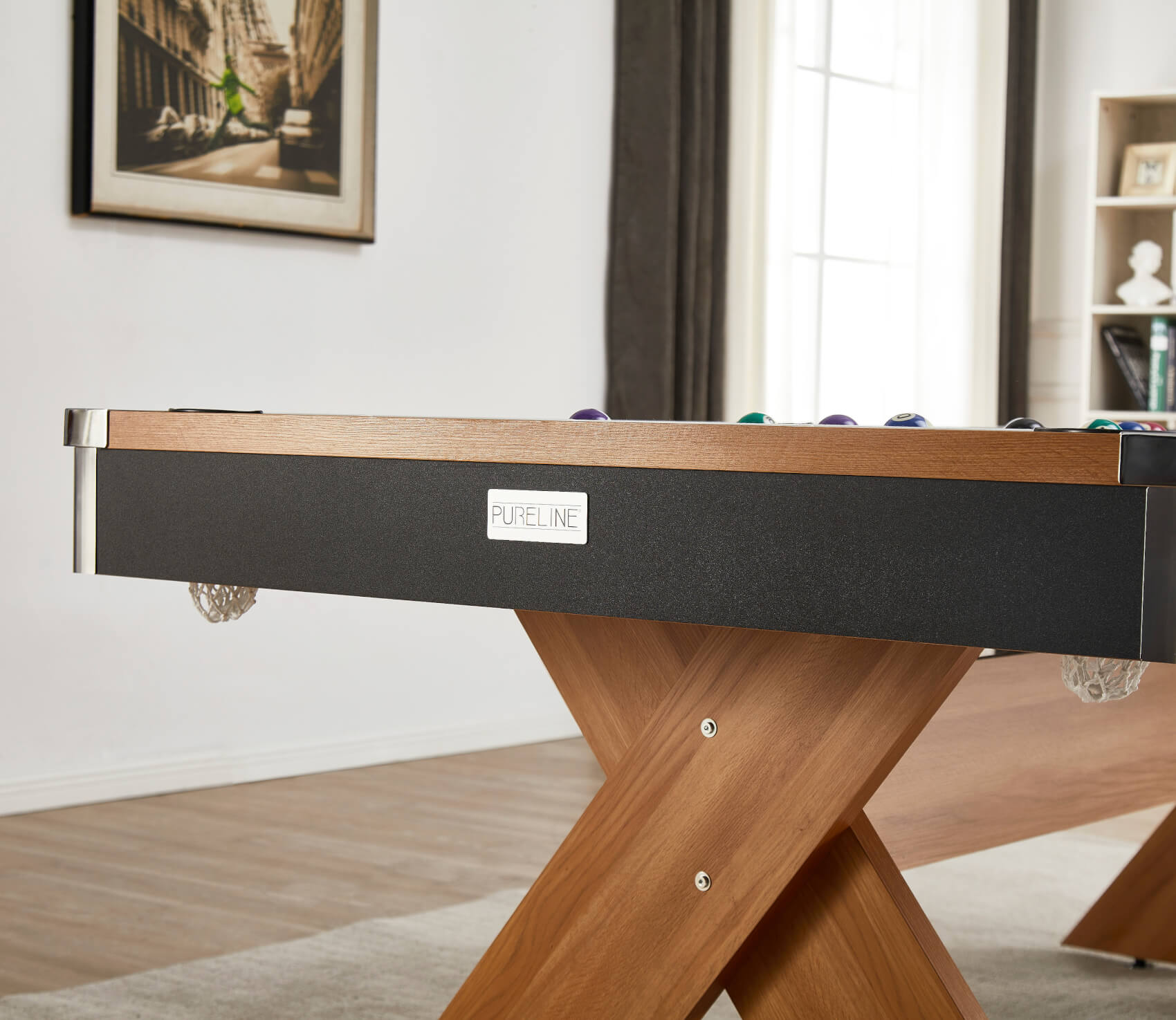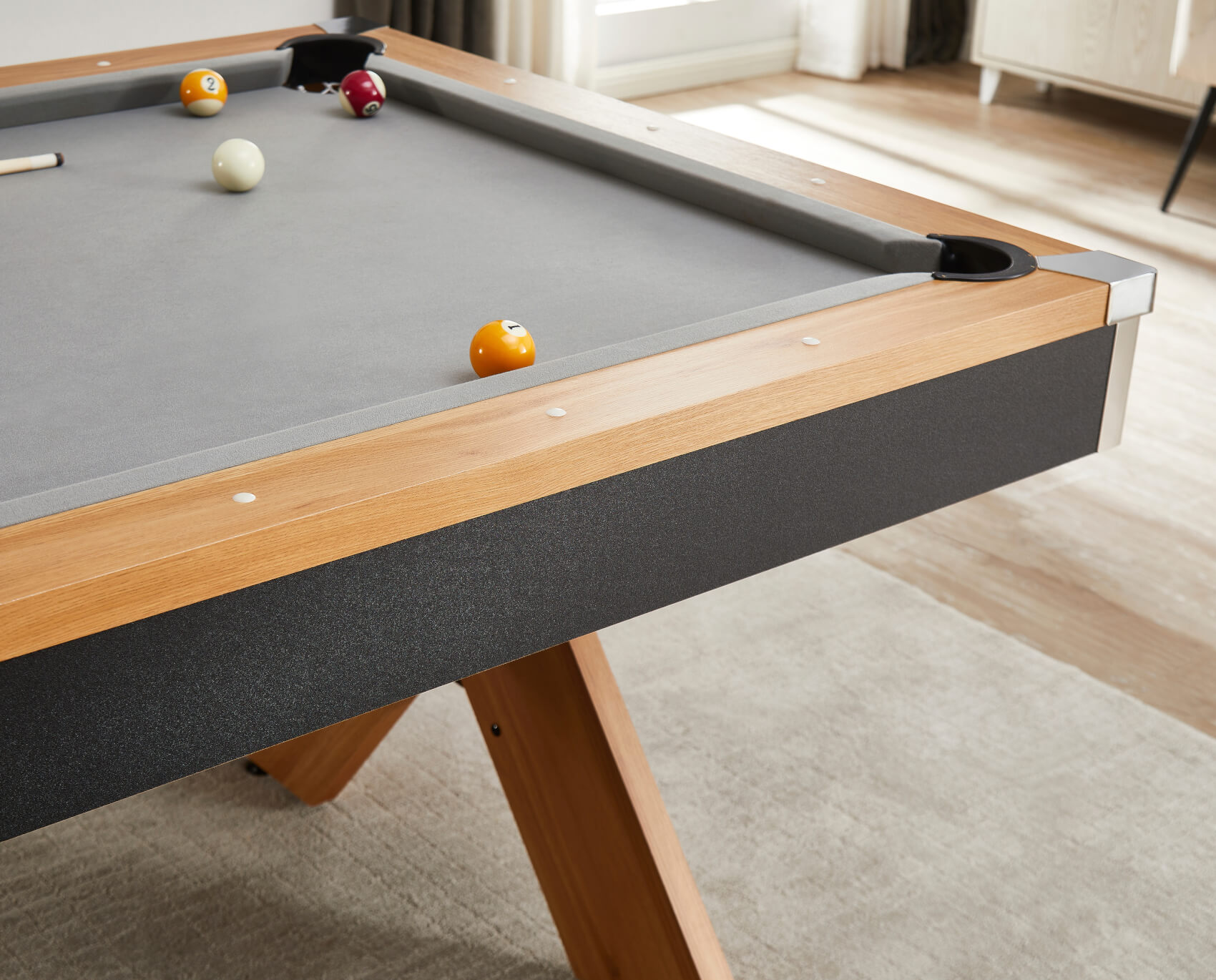 That slim cabinet is built in a strong wood composite and you can order yours in either 6ft size or 7ft, depending on the space you have available (and don't forget to calculate your cueing room). The criss-crossed legs give the table excellent stability and the lengthways brace adds even more strength. Level adjusters on each foot give you the ability to level the table for a perfectly straight ball roll in any direction, on any surface.