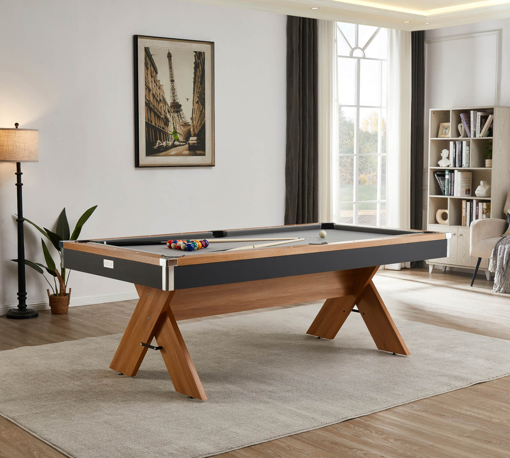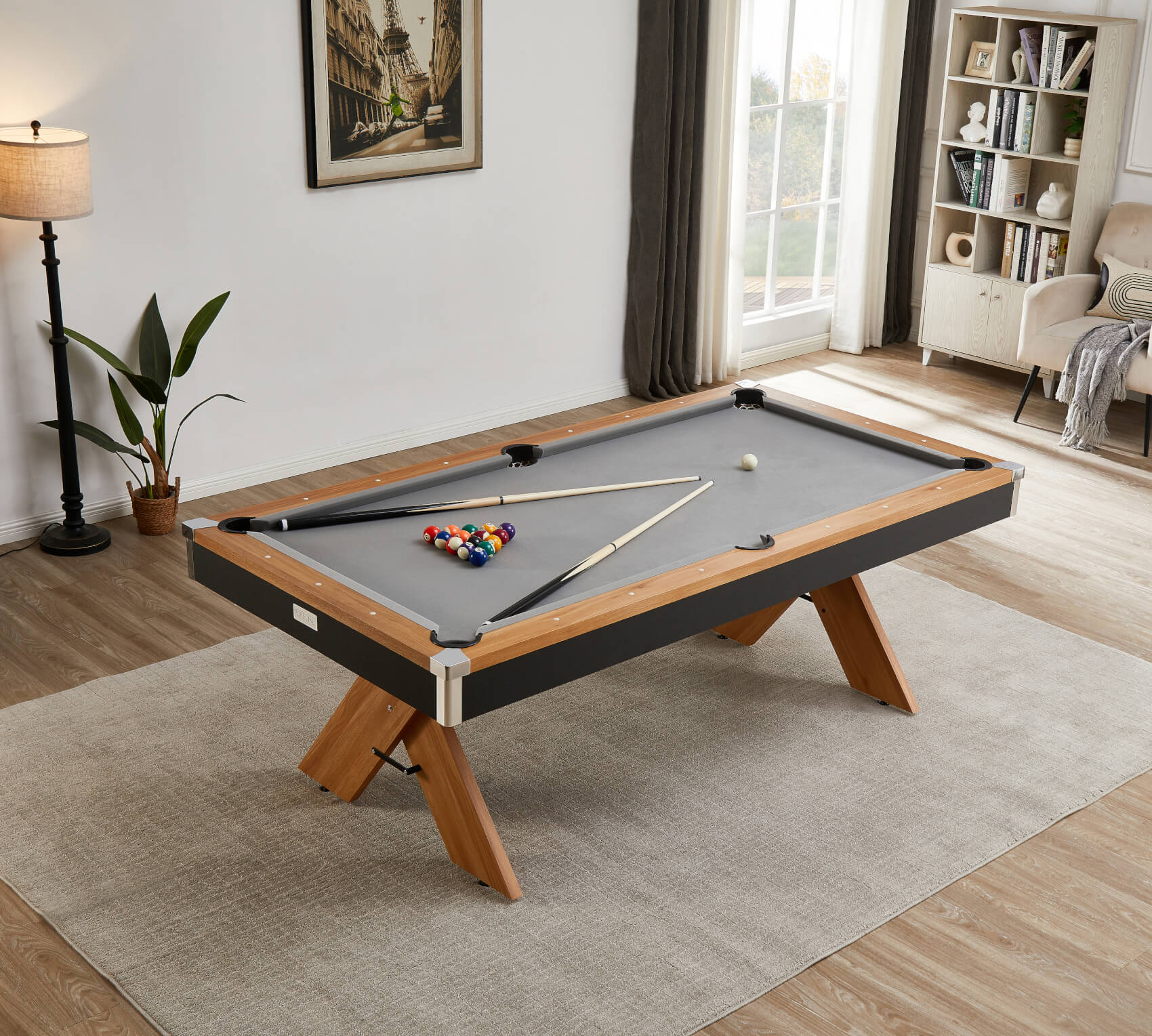 The pool table is equipped with an 18mm MDF playfield bed, moulded for absolute flatness. It's fitted with a quality cloth in a stylish grey colour. Around this are bouncy rubber cushions that give your rebound shots lots of power, and drop pockets that collect your balls as you play. Aiming sights in the top rail help you to line up your shots.