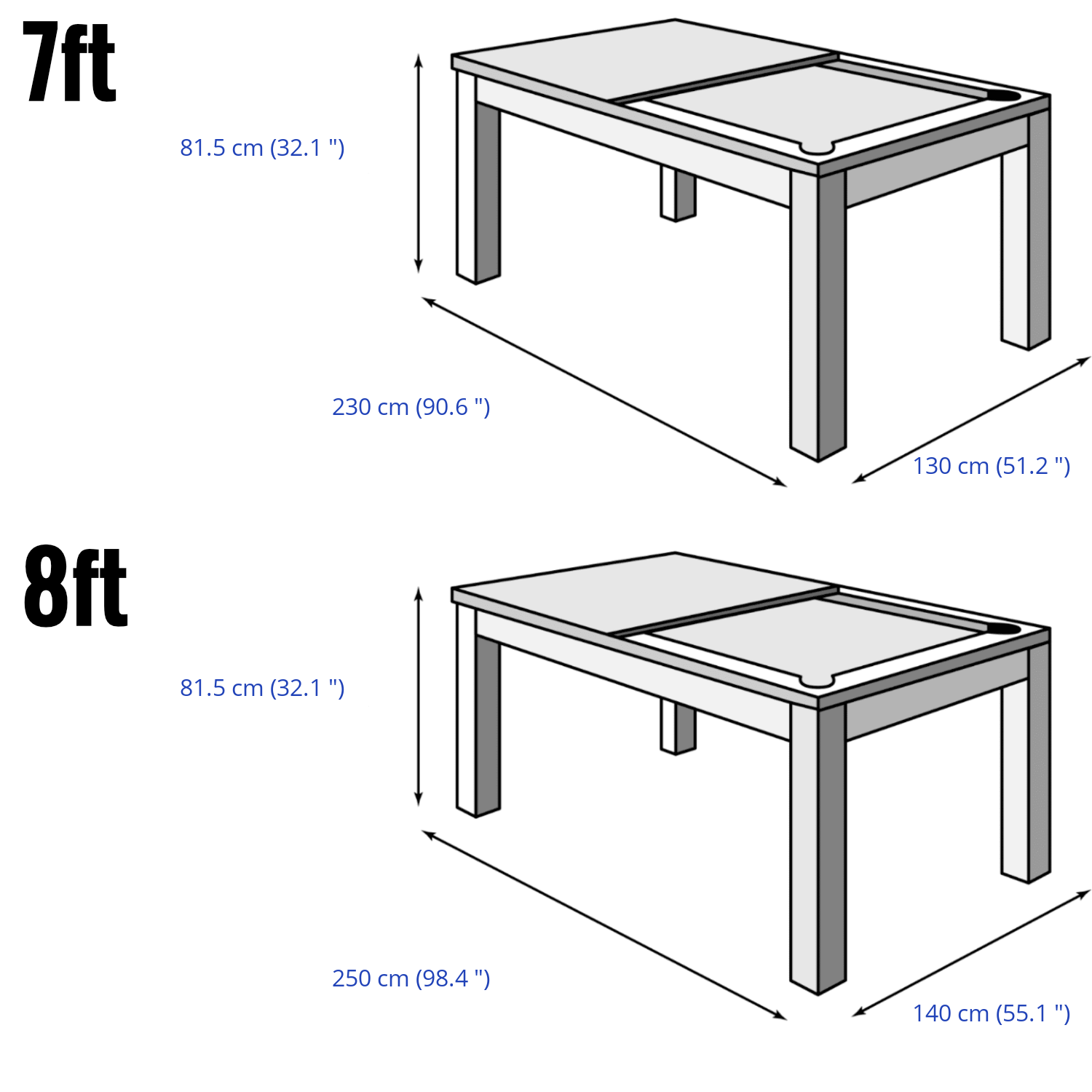 We can supply this stunning Horus table in two different sizes; 8 feet long in American spec is the standard, but you can go one foot smaller to a British-spec 7ft. A 9ft American table is available on request - please call us to enquire.