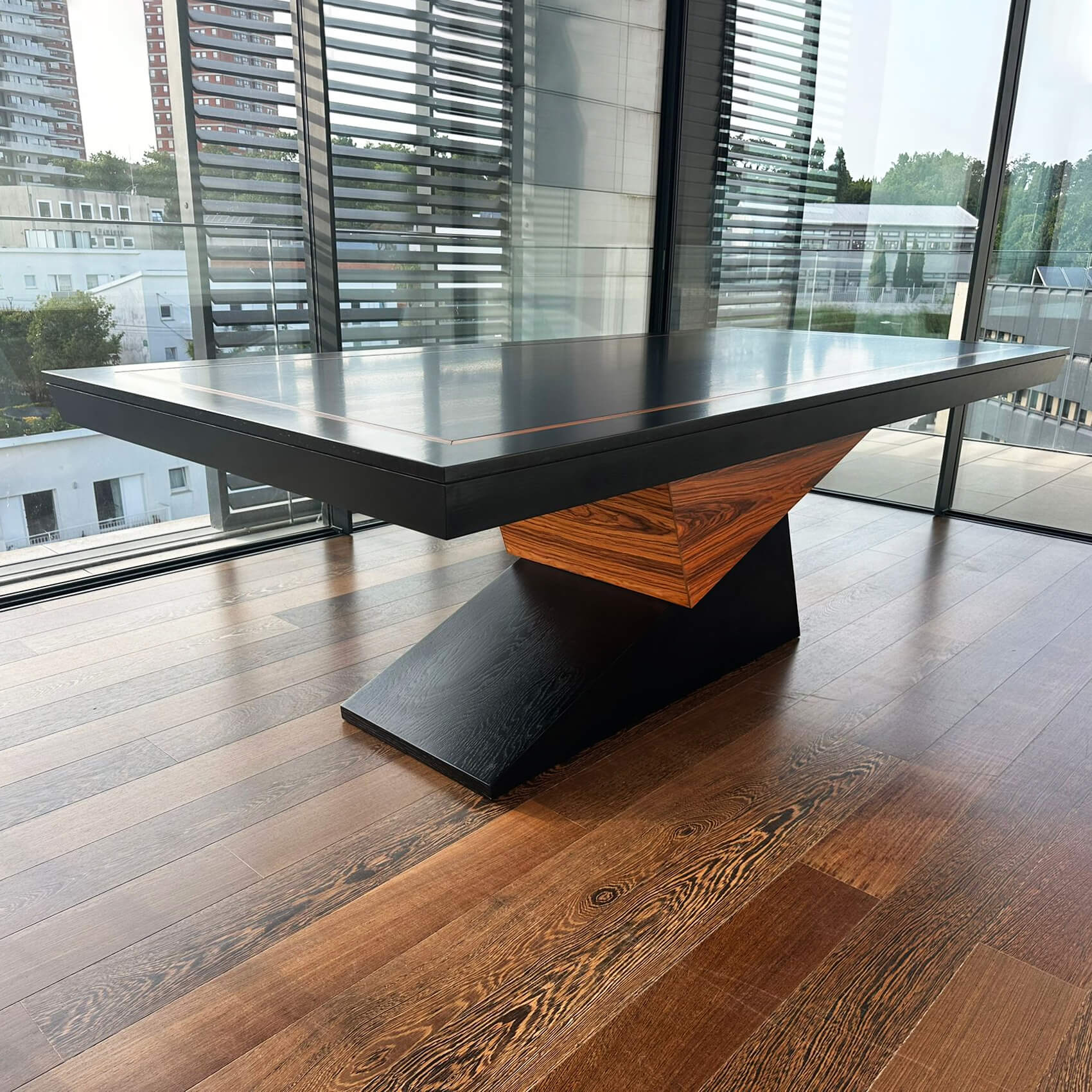 Bilhares Europa supplies the Meridian with a choice of table tops, which instantly transform the piece into a handy dining table. Choose from a matching finish one or both sides, or a custom designed glass top. Avid gamers can choose a reversible top that has a smooth ping pong surface on the other site.