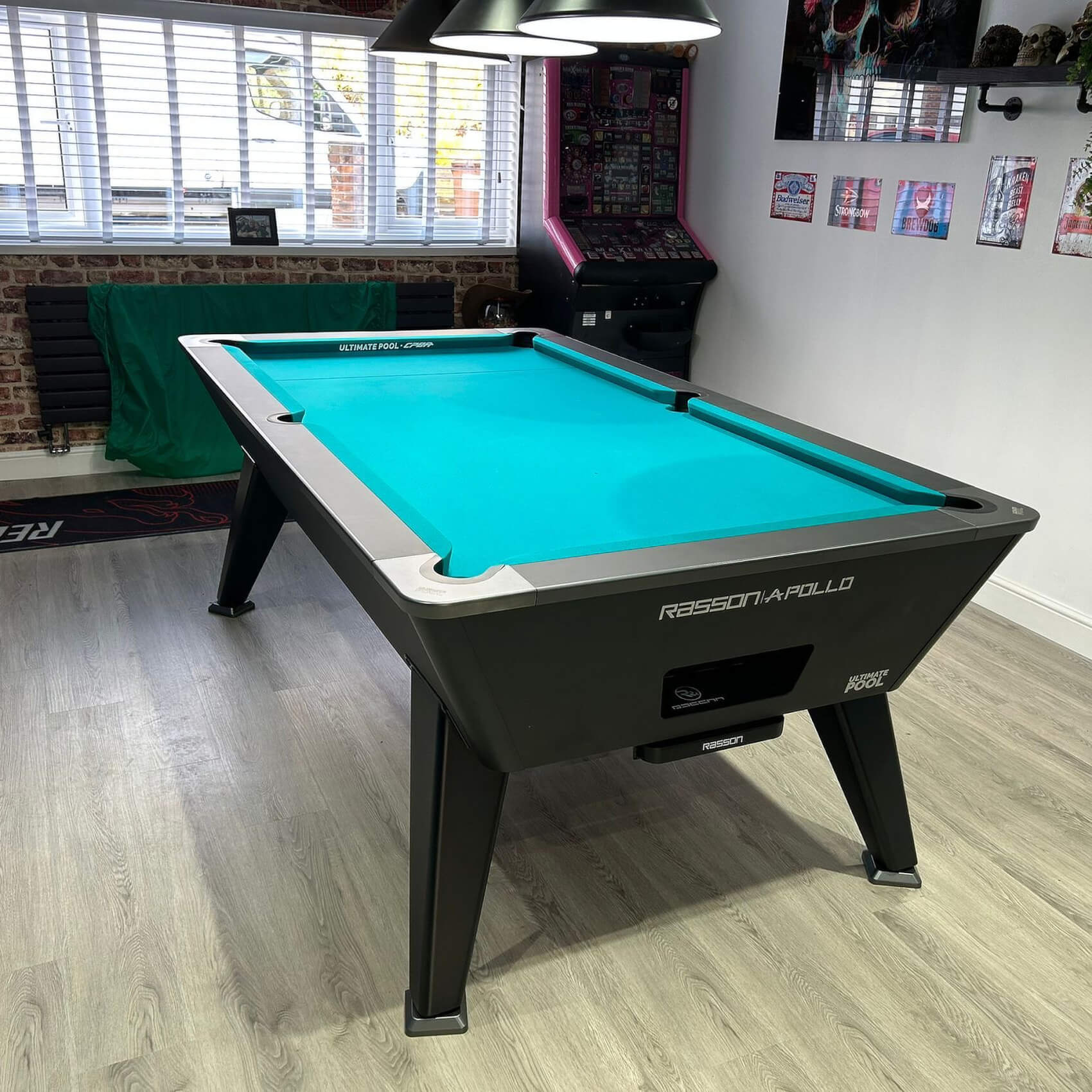 Enjoy true tournament-level performance and quality with the Rasson Apollo by Ultimate Pool! Equally at home whether under the spotlights at the world's biggest pool tournaments, or as a centrepiece in your own games room, this is a premium competition table with performance that satisfies professionals and amateurs alike. It's made to meet regulation British pool specifications and is the official table of both the Ultimate Pool Championship and the prestigious nine-ball Mosconi Cup. It's also used regularly in official EPA, World 8-Ball Federation and TNT Sports events.