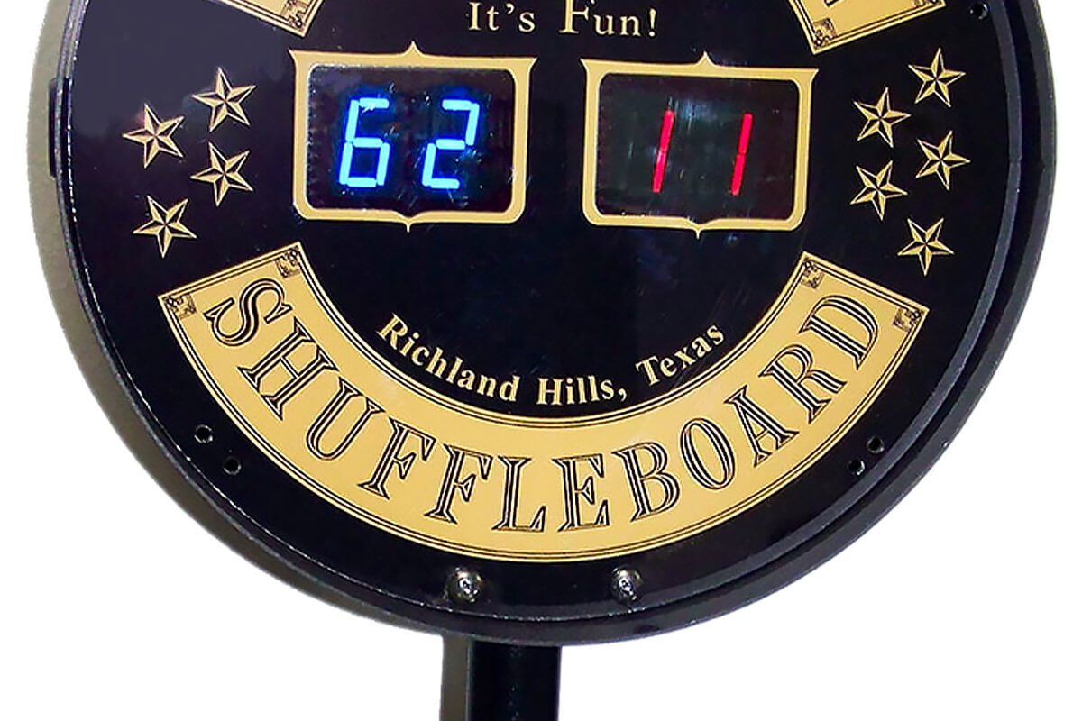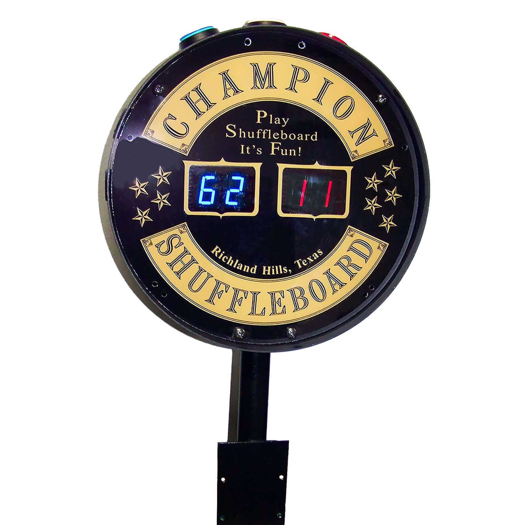 It features high-quality decals and Champion Shuffleboard branding. The Rail Mount Score Unit includes dual LED score displays, with one for each player or team. This means that you can see at-a-glance where the game is going!