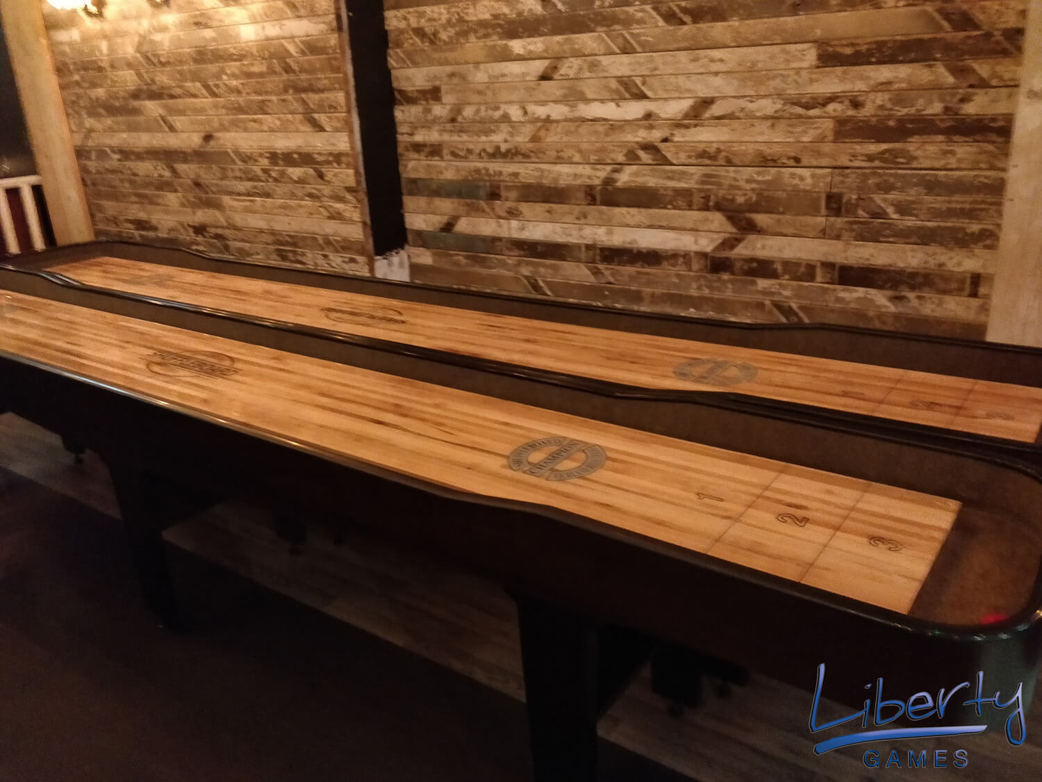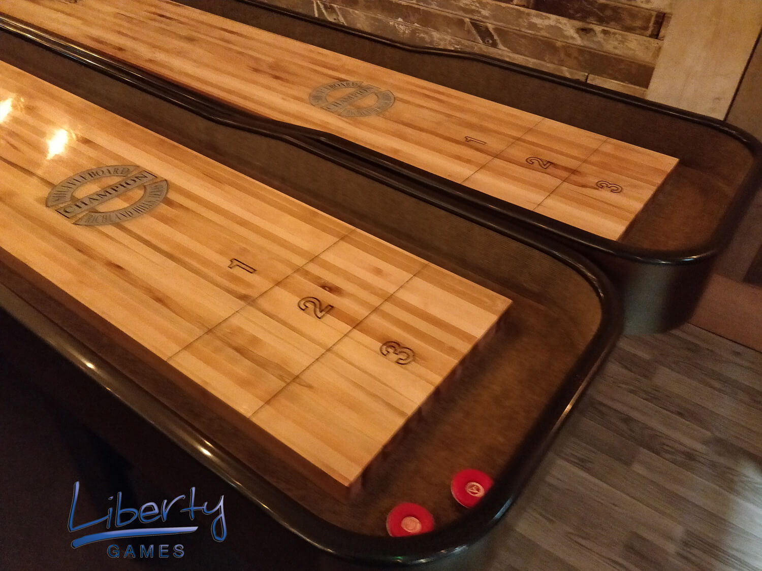 The cabinet is tough and built from premium maple veneer, designed to give years and years of service. The maple legs are tough and extremely strong. The playfield itself is made from a solid piece of Canadian maple, finished to precision and polymer-coated, and slightly concaved. It features Champion's unique and patented Handicap Scoring system.