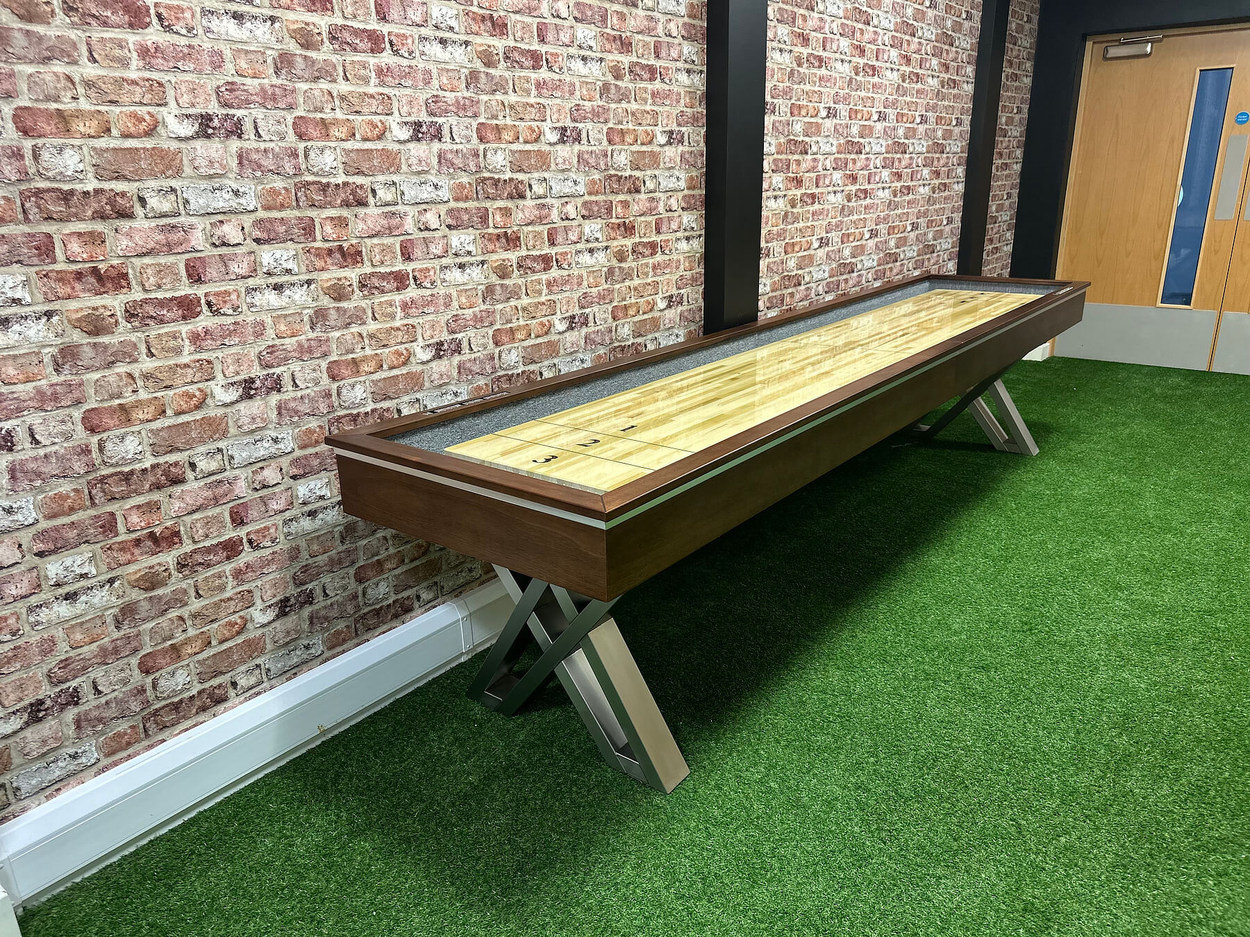 Always fancied a shuffleboard table but were put off by how similar they look? Introducing the Pierce shuffleboard table from Presidential Billiards in Texas, USA. At 12ft in length it offers plenty of space for those long glide shots, and brings the shuffleboard style firmly into the 21st century with those striking X-shaped stainless steel legs.