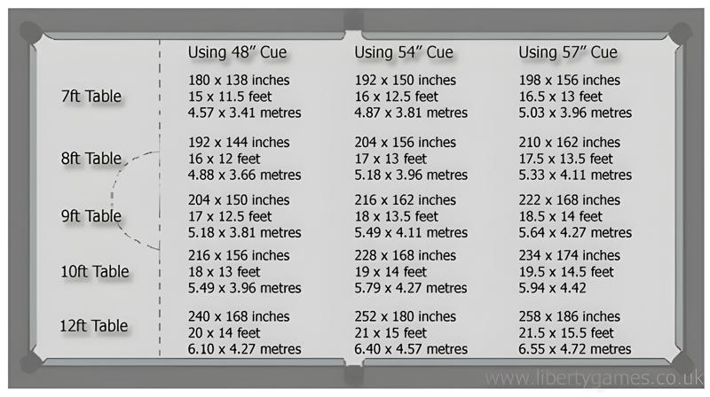 When choosing your table size it is important to consider the dimensions of the room you wish to place it in. It is recommended that there is enough room to fully extend your cue from the table edge to the nearest wall.