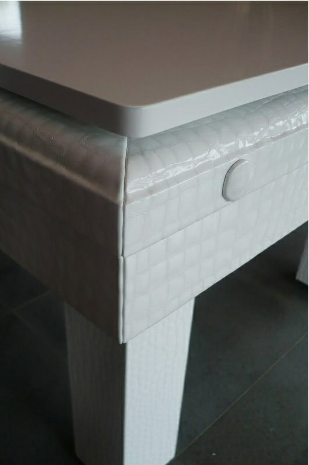 This is a designer contemporary-styled table with an iron frame, African Kotibe hard wood structure and a covering of fine Top Grain leather which has been carefully stitched and bonded to create a wonderful tactile quality that is quite unlike any other range of tables.