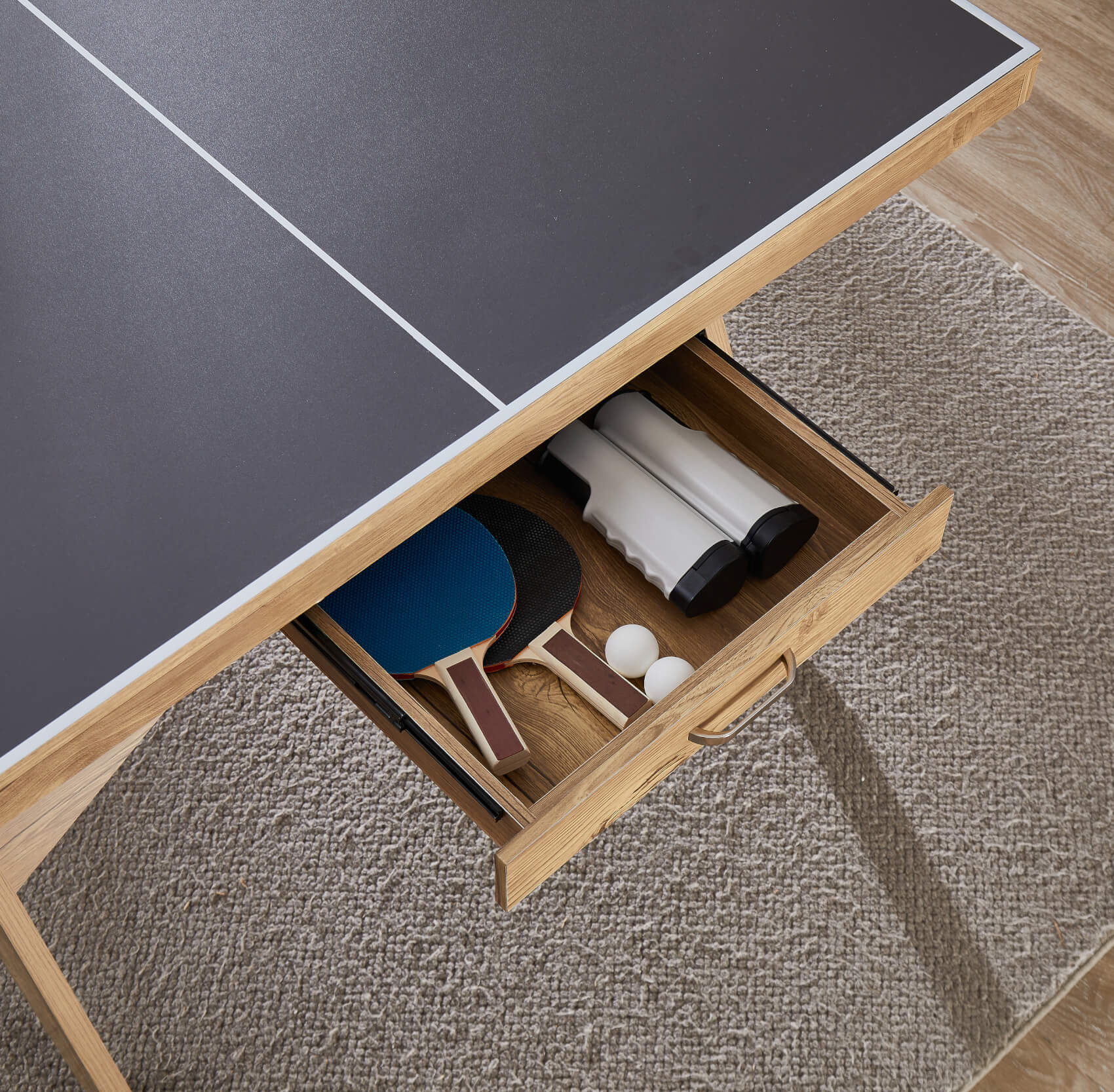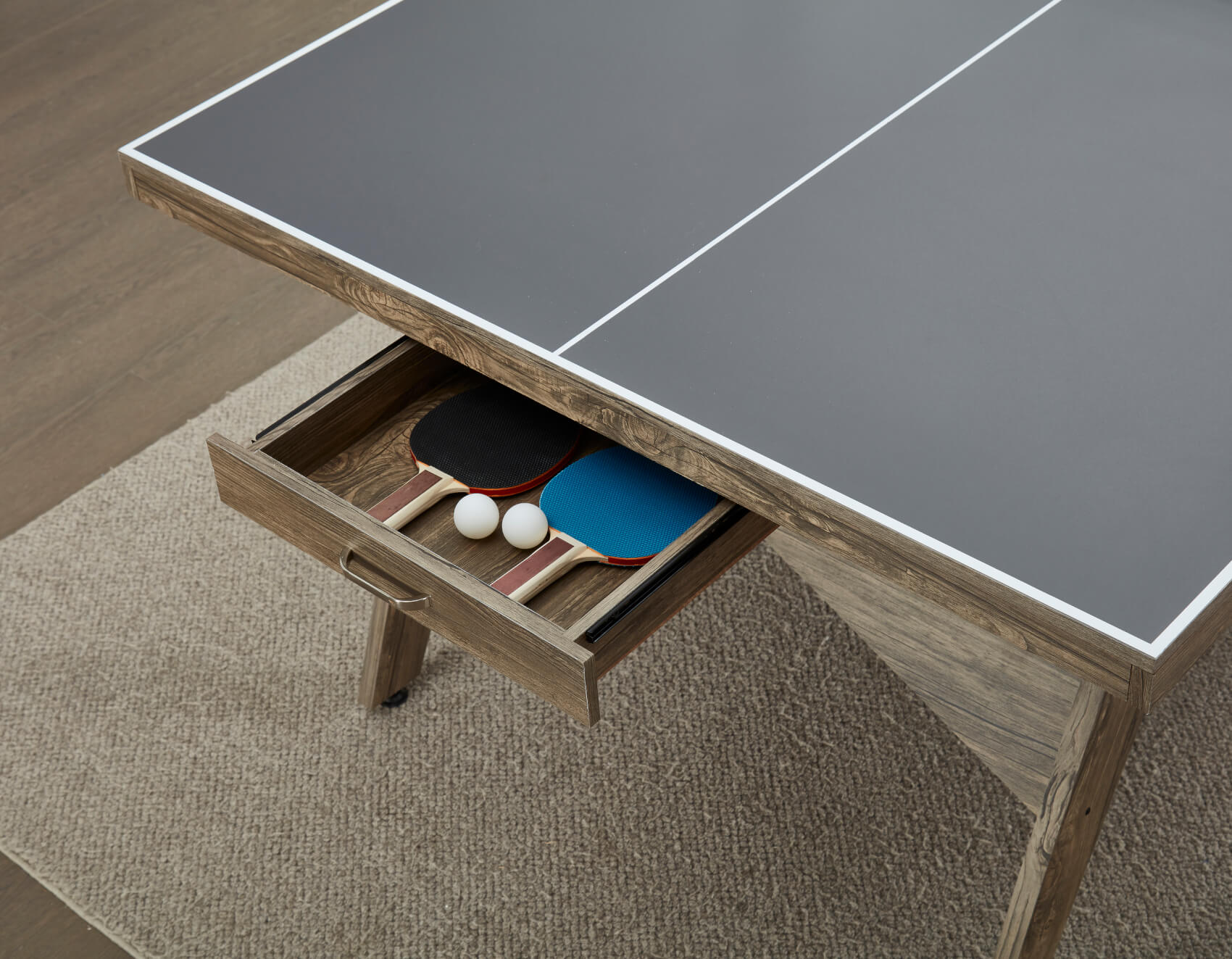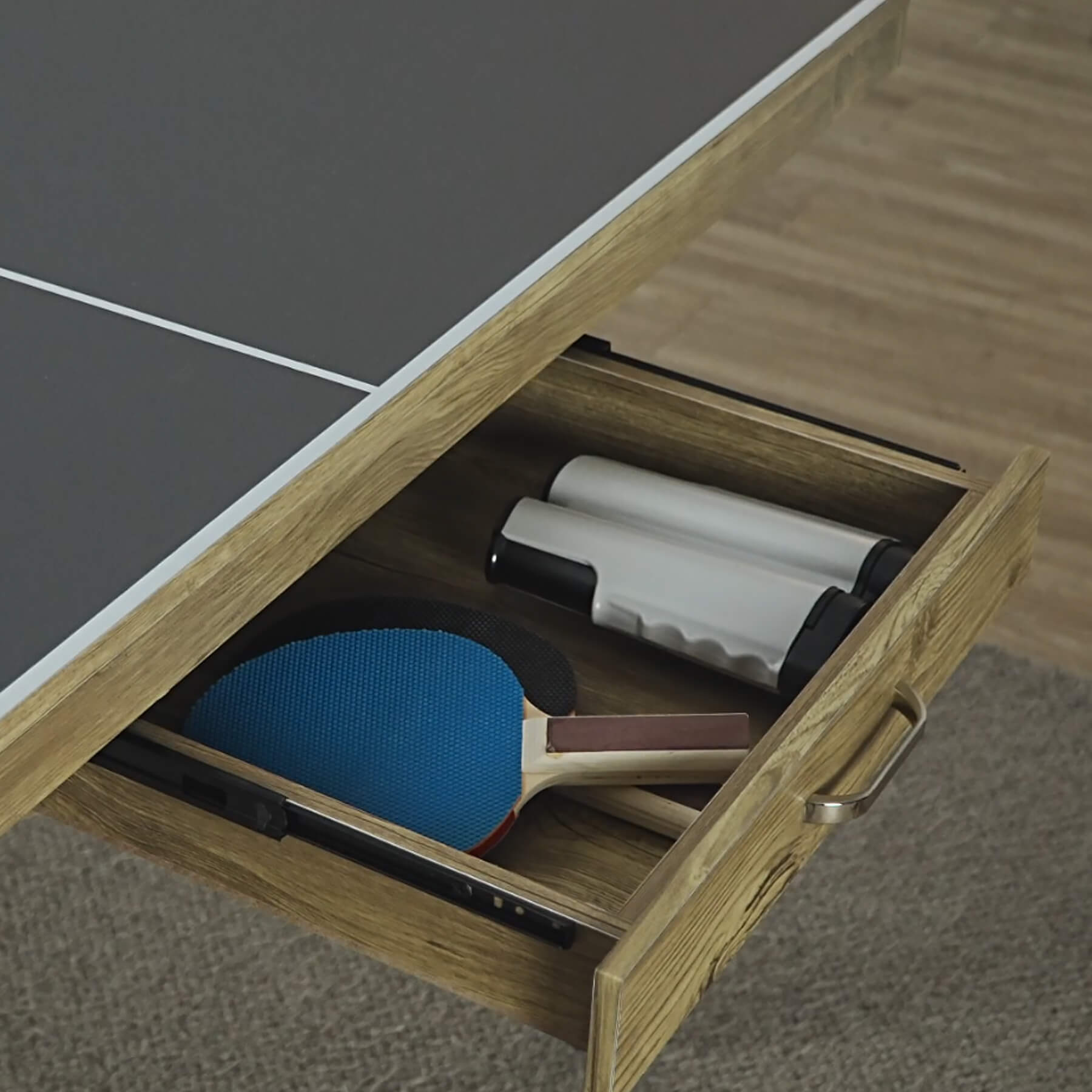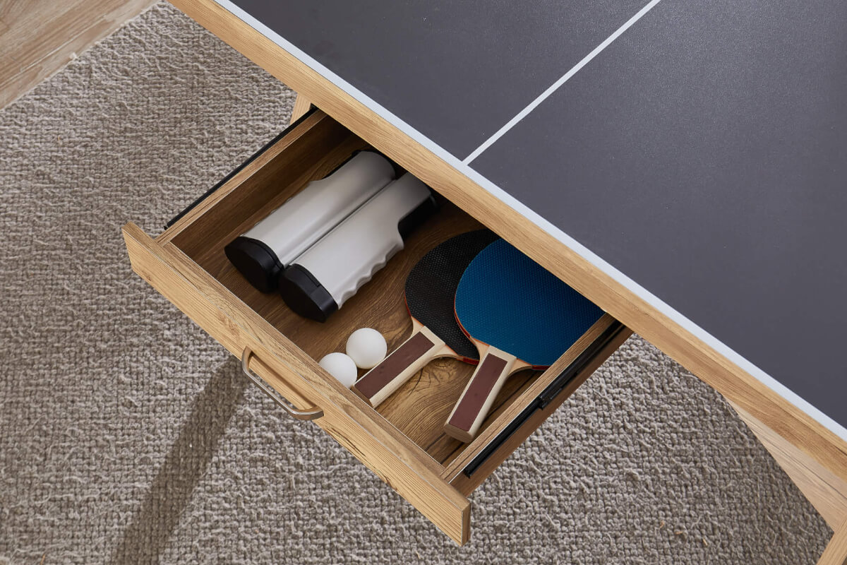 The Lifestyle is a 7ft table at 213cm long - that's smaller than the full regulation table tennis size of 274cm, making it easier to find installation space in busy homes. A generous space under the table of 70cm gives ample leg room for diners sat on benches or chairs. At each end of the table are unique pull-out storage drawers - perfect for keeping your bats, balls and net stored safely away after play.