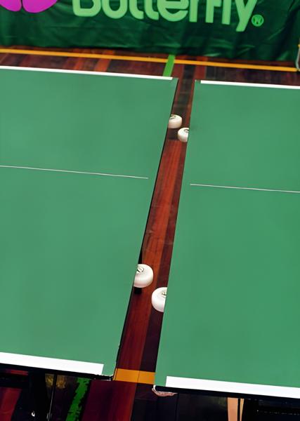 The playing top is 12 mm thick. It is protected by a strong steel frame and magenta corner pieces. Provided with the table is a simple to use Butterfly clip net and post set which is the same height as a regular net, 6 inches high.