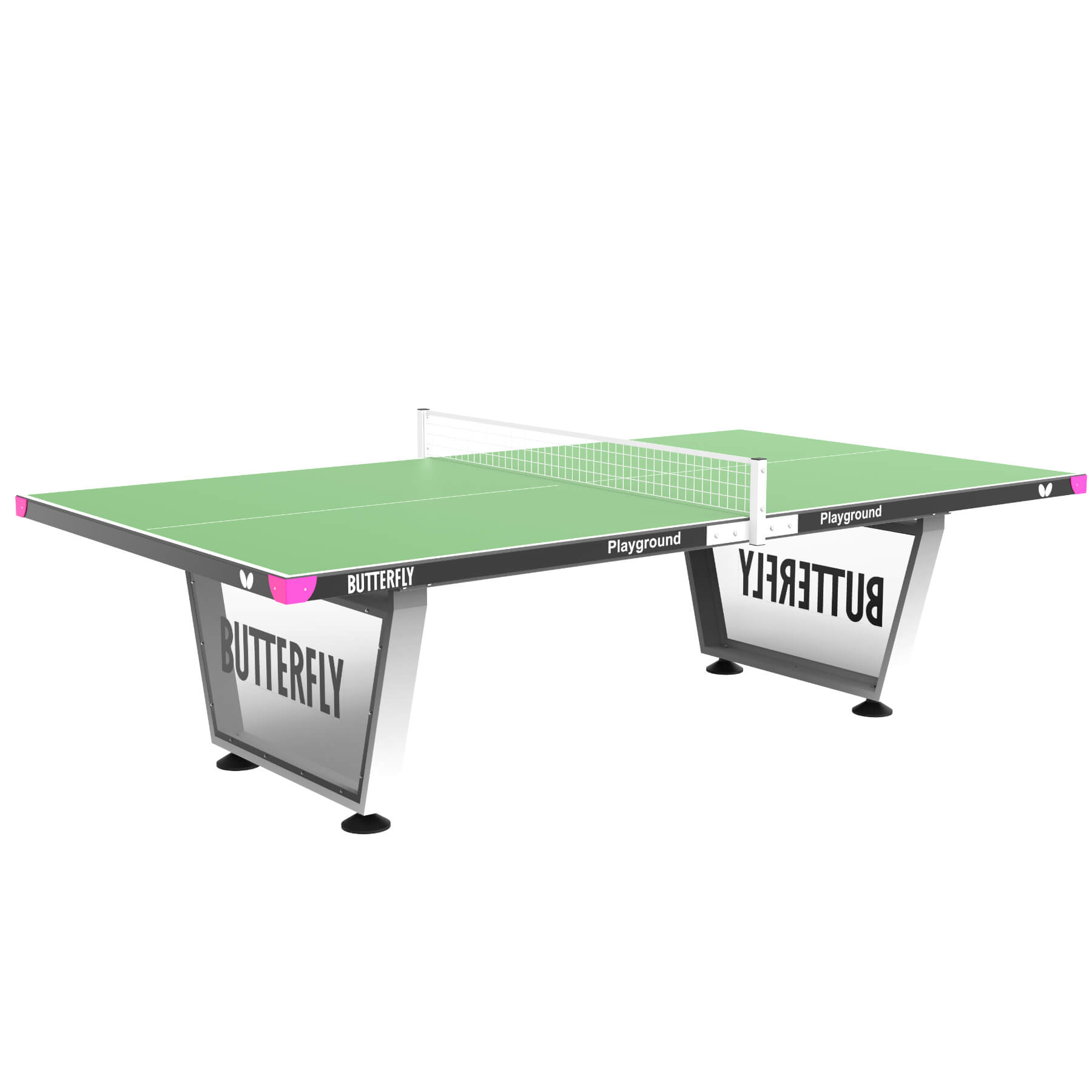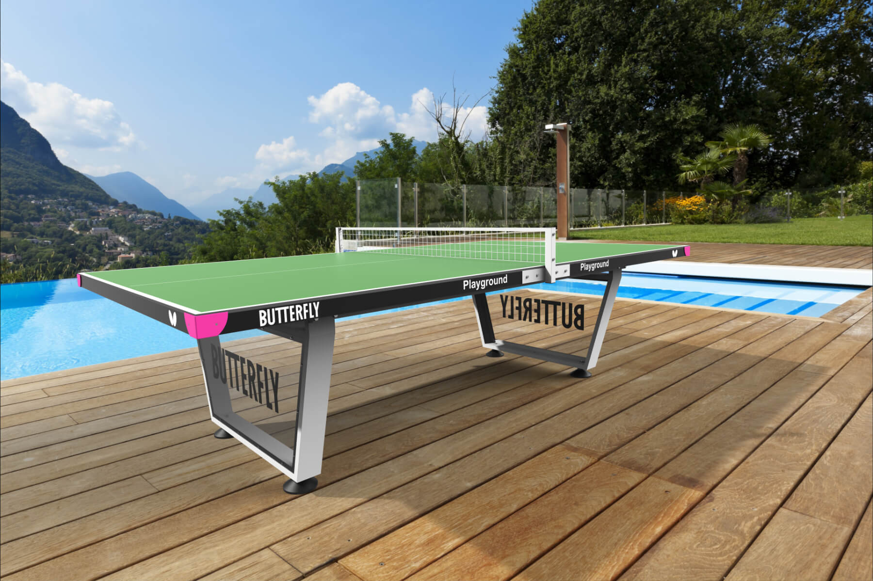 The Butterfly Playground is a stylish tennis table that can be used indoors or outdoors.