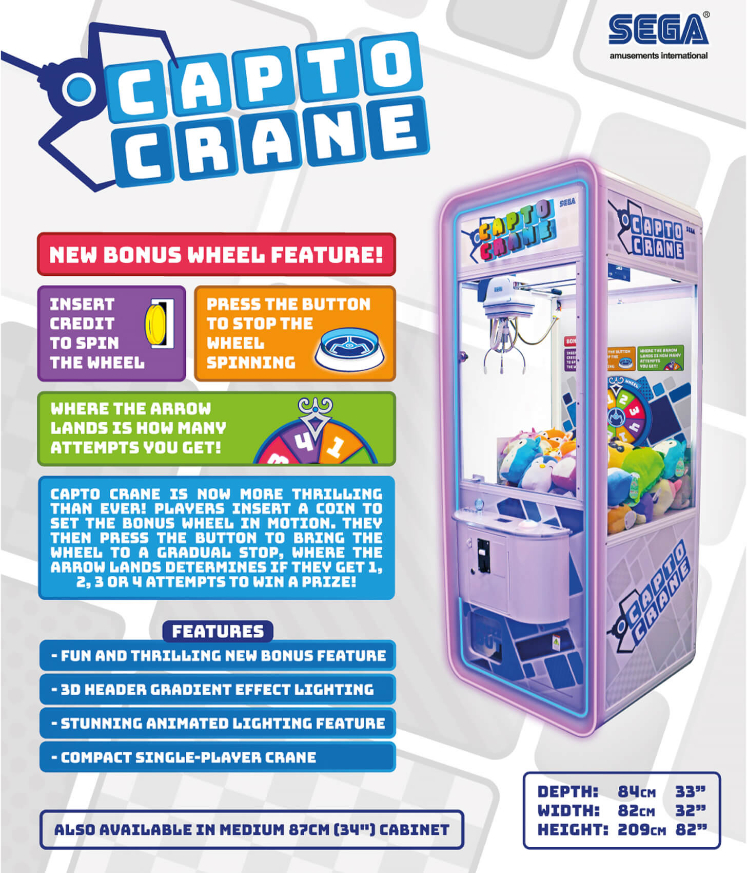 Spin the wheel and try to grab onto your favourite prizes with the Capto Crane Bonus Wheel Arcade Machine By SEGA! It's an updated version of the SEGA Capto Crane Arcade Machine and features a redesigned spinning wheel which gives players a certain amount of tries to win a fun prize!