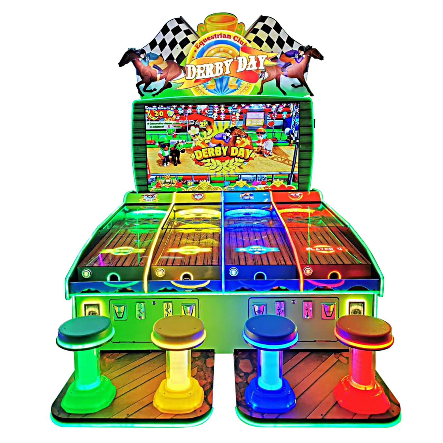 The Derby Day's tough cabinet features sections of plexiglass over each alley for upgraded visibility and long-term durability in commercial arcades and low-light environments. It features a huge 71-inch LCD screen which displays all the gameplay, scores and characters in vivid detail - with exciting pop-up graphics, animations and sound effects which appear as the game intensifies!