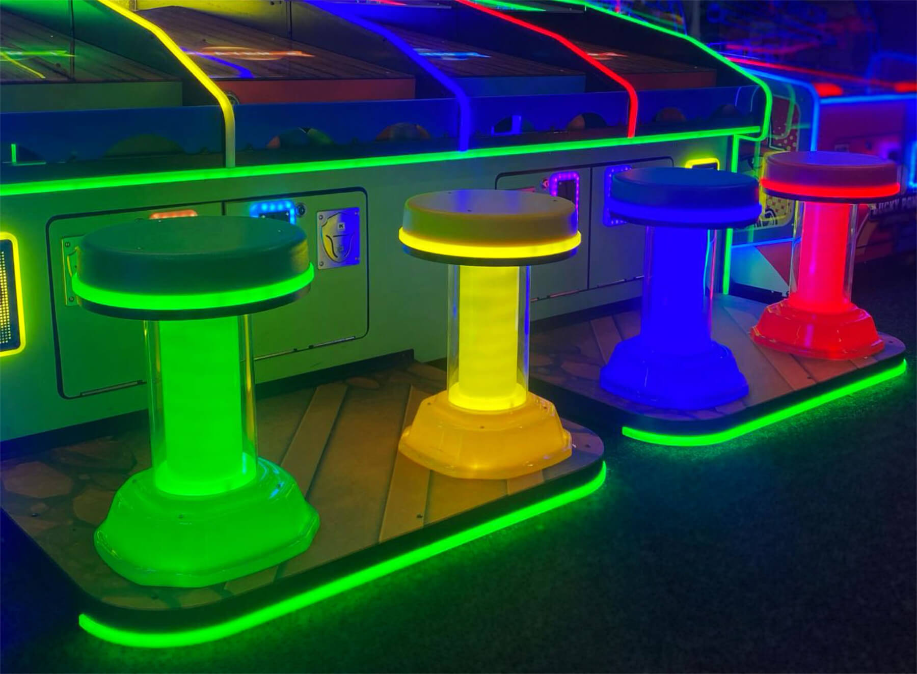 The Derby Day Arcade Machine offers built-in, comfortable and spacious seating for up to four players as well as colour-coded alleys, balls and LED lighting! To make sure your horse crosses the finish line first, take aim and roll a ball into a hole with the highest score. Your stallion will leap forward and into action based on the points gained from your throw, but do beware as a bad throw could land in a hole with a low score or even miss completely, letting your competitors speed past!